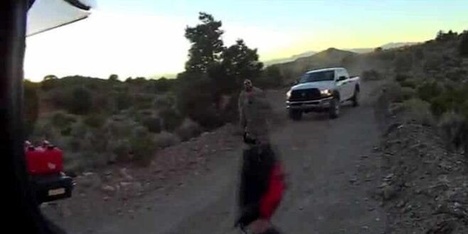 Ils exploraient une entrée secrète arrière qu’ils avaient tracée dans la célèbre Zone 51, quand ces hommes se sont présentés dans ce pickup, avec des armes pointues sur eux, et ont exigé qu’ils partent. Cela ne rigole pas avec le secret défense !