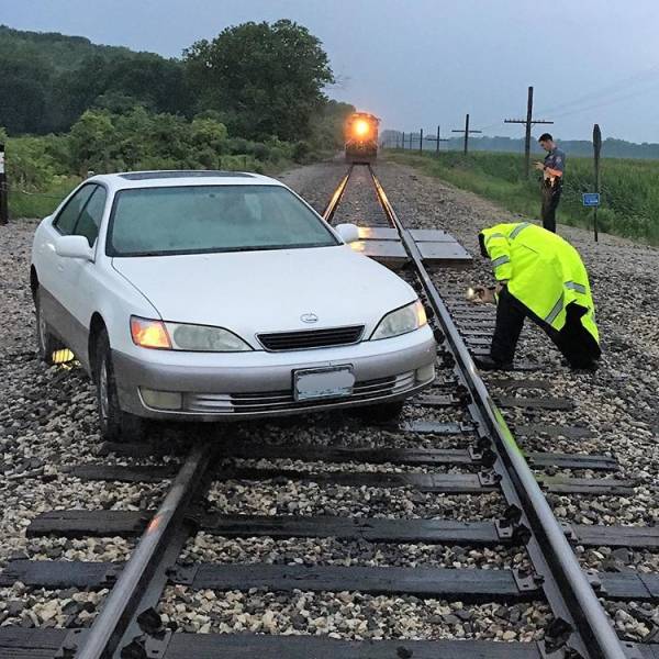 Heureusement, le personnel a vu le véhicule coincé sur la voie ferrée et a pu faire arrêter le train juste à temps. Un terrible accident a pu être évité de justesse.