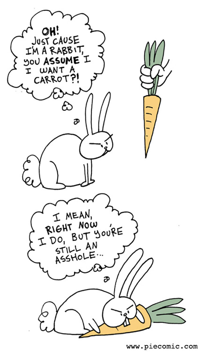 Oh parce que je suis un lapin, donc tu supposes que je veux une carotte. Je veux dire ok d’accord maintenant, oui je veux, mais tu es quand même une enflure.