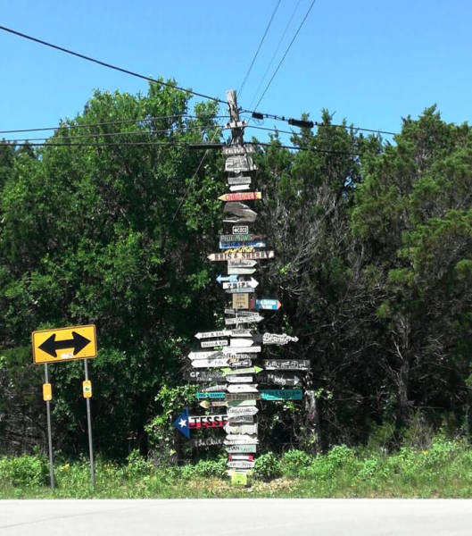 Un panneau de rue atypique. Celui-ci indique la direction dans laquelle vit chaque personne dans la ville.