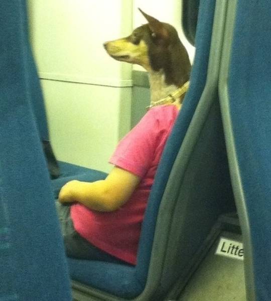 Un chien qui porte du rose, avec un corps d’humain et qui prend le train. La combinaison parfaite pour perdre la tête.