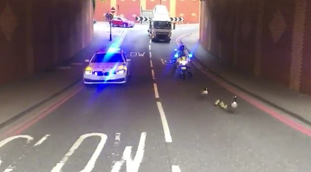On peut y voir deux parents oies et six oisons se dandinant sous un pont, protégés par une voiture de police et une moto de patrouille.