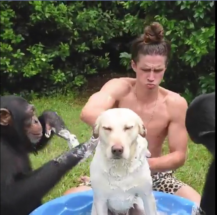 La vidéo hilarante montre un chien dans une baignoire en train de recevoir un lavage en profondeur de la part de deux chimpanzés et d’un homme. Les deux chimpanzés ont été identifiés comme étant Vali et Sugriva par Kody dans la section commentaires de la vidéo.