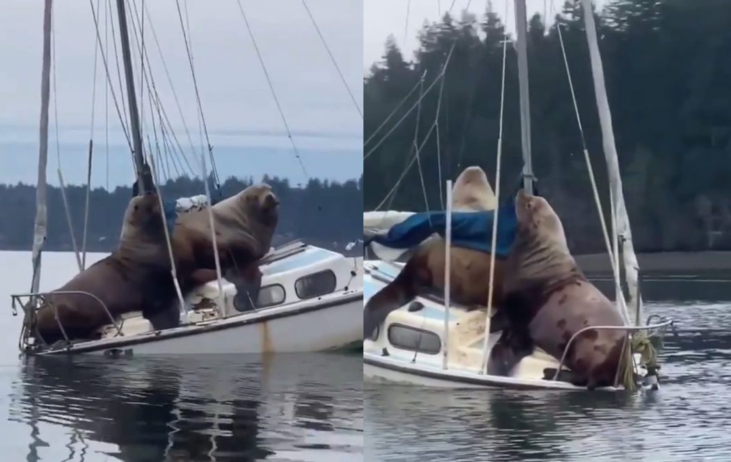 Deux énormes phoques se sentaient probablement fatigués et ont décidé de faire une petite pause. Il y avait un petit bateau près d’où ces créatures nageaient et c’est où ils ont décidé de faire leur pause !