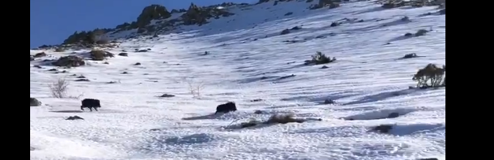Ces derniers traversent ce flanc sur la neige mais un de ces cochons sauvages va glisser sur la neige. N’ayant plus rien pour se rattraper, le sanglier glisse, en direction des deux femmes.