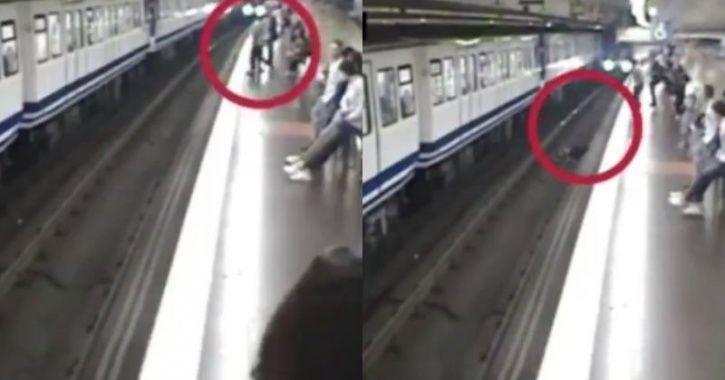 Soudain, elle tombe brusquement sur la voie ferrée alors qu’un métro se dirige vers elle.