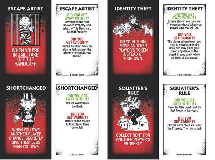 Avec ce Monopoly nouvelle édition, 15 nouvelles cartes spéciales triches ont été créées pour faire votre bonheur. Elles seront parmi les cartes Chance et Caisse de Communauté. Les règles du jeu restent les mêmes, vous devez faire le tour du plateau, faire des achats et gagner beaucoup d’argent en dépouillant les autres joueurs, rien ne change.