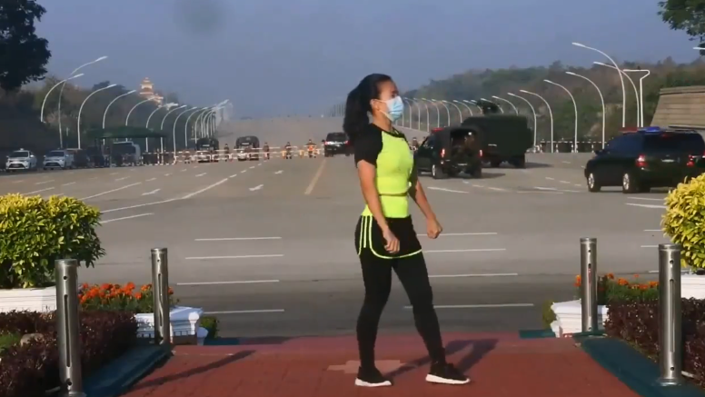 Depuis plusieurs jours, le coup d’État perpétré par les militaires à Myanmar défraie la chronique. Dans cette vidéo, cette jeune femme est loin de comprendre ce qui se passe derrière, alors qu’elle s’active pour enregistrer sa séance d’aérobic devant sa caméra. Elle enregistre sans le savoir alors que l’armée prépare son entrée au parlement.