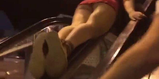 Une robe un peu trop courte pour cette jeune femme qui voulait monter cet escalator sur la rambarde noire. Sauf que quand elle arrive presque au sommet… elle redescend durement tout en bas. Aie !