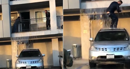 On ne sait pas trop ce qui s’est passé dans la chambre de ce qui paraît être un motel, mais de l’eau coule à profusion, sortant par la porte et se déversant dans le parking. Celle-ci ne manque pas de mouiller abondamment une voiture au passage.
