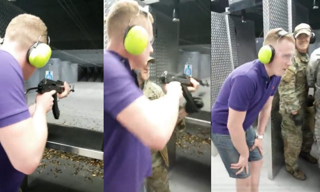 Un jeune homme s’entraîne à utiliser le super puissant AK–47 Kalachnikov lorsque son déclencheur se bloque et commence à tirer sans arrêt.