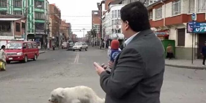 Un journaliste Bolivien était en plein tournage en direct lorsque deux chiens amoureux sont passés derrière lui, et ont été capturés par la caméra.  Au début, le reporter essayait de se retenir de rigoler mais il n’a pu tenir jusqu’à la fin. Il a fini par rigoler en pleine émission. La vidéo a été ensuite partagée sur la toile est très vite devenue virale.