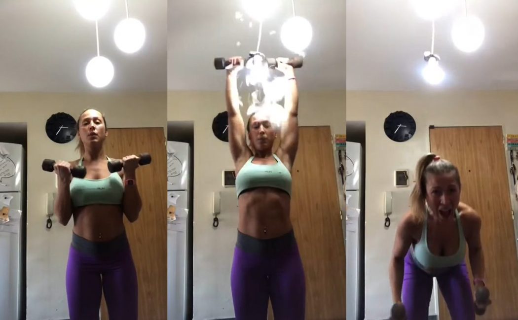 Elle avait des haltères dans les deux mains et quand elle levait ses mains en haut elle a accidentellement cassé la lampe de sa chambre qui a été juste en haut de sa tête.