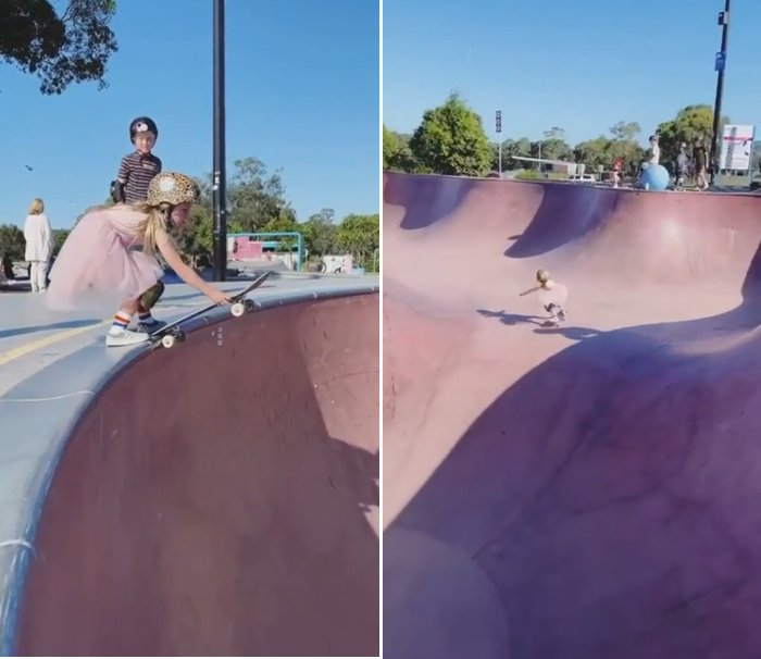 Dans ce skatepark, cette petite du haut de 6 ans réalise une descente avec son skateboard comme un pro. Dans sa tenue de princesse, elle est adorable.