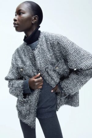 C’est donc une veste H&M impeccable à porter à tout moment de votre journée. L’une des caractéristiques les plus intéressantes de cette veste reste son tissu texturé, avec des fils brillants.
