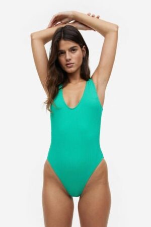 H&M mise tout d’abord sur un col en V pour équilibrer la silhouette et offrir tout le confort nécessaire pour une longue journée à la plage. La marque opte aussi pour un tissu texturé qui donne un effet ultra tendance.