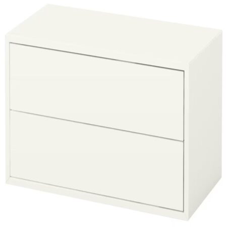 Comme cette commode EKET dotée de deux tiroirs coulissants. Ce petit meuble Ikea peut être placé au niveau du sol ou ancré au mur avec les rails de support incorporés. Il est aussi possible de créer des combinaisons avec les autres références de la gamme pour donner vie à un système de rangement qui répond à vos attentes. Son prix : 50 €.