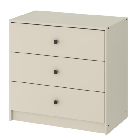 Craquez aussi pour cette petite commode GURSKEN qui ne manque pas de charme. Ce meuble beige clair trois tiroirs est idéal pour ranger du linge de maison, des sous-vêtements ou encore des papiers ou magazines.