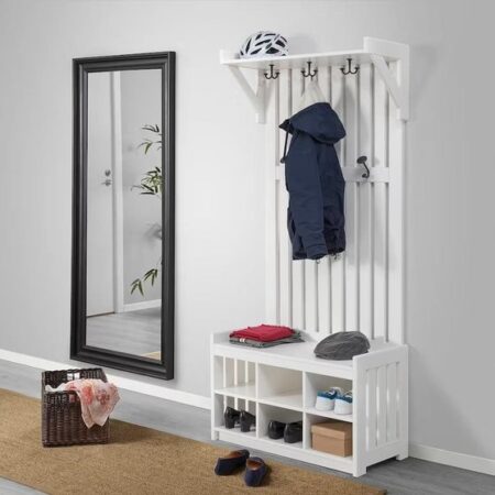 Il sert de meuble d’accueil ou de complément au dressing. Le produit vendu par Ikea comporte une étagère supérieure avec une finition lisse avec 3 crochets en bas, 3 crochets en plus sur la paroi arrière.