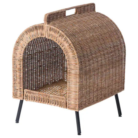Ikea a aussi mis en vente une maison pour chat surélevée en rotin. La firme a révélé : « Les pieds surélèvent la maison afin de laisser circuler l’air en dessous. L’anse sur le dessus permet de soulever et déplacer ce produit d’une pièce à l’autre ».