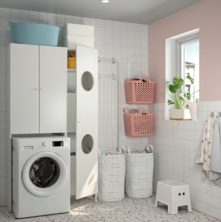 Pour contourner le problème, Ikea sait cependant y faire ! La marque suédoise innove avec son meuble NYSJÖN qui optimise l’espace inutilisé au-dessus du lave-linge.