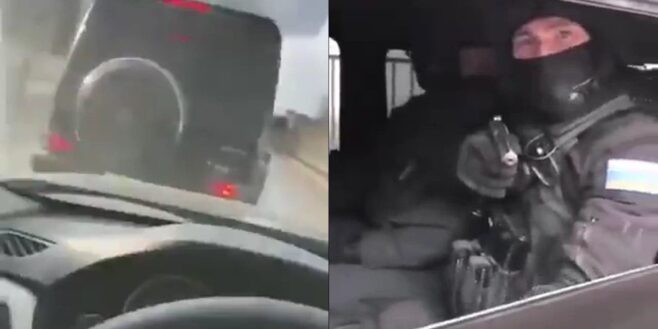 Quand la fenêtre de la voiture noire a été ouverte, un homme armé et habillé tout en noir, qui semble être de la garde nationale, s’est apparu et a pointé son arme vers l’autre homme.