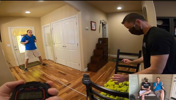 Hannon a lancé au total 108 balles de tennis en une minute. David a réussi à attraper 85 balles dans le panier, acheté par la femme d’Hannon, et bat ainsi son dernier record qui était de 66.