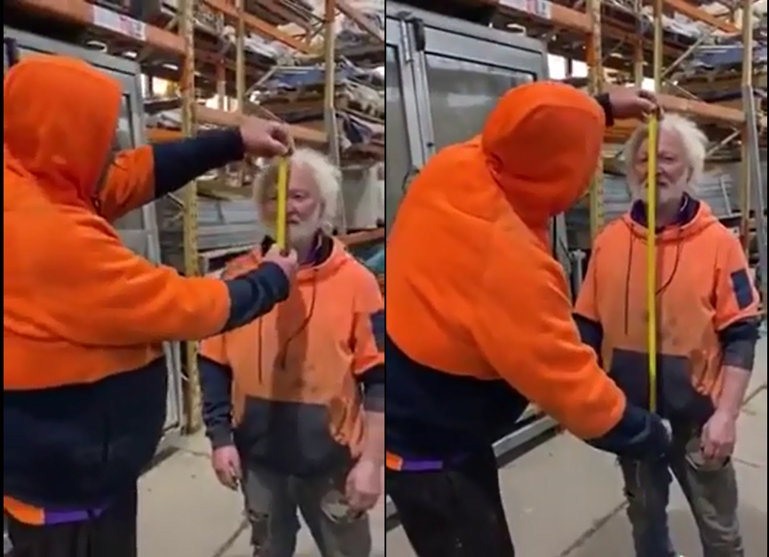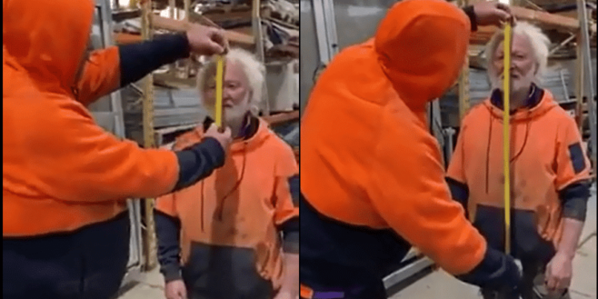 Ces deux hommes sont partis pour une activité amusante qui a pour objectif de mesurer le corps. Le plus vieux se prête bien au jeu, mais ne s’imagine pas que son collègue est en train de lui faire une mauvaise blague. Il commence à lui mesurer sa figure puis la partie haut de son corps, en s’assurant que le mètre ruban arrive bien jusqu’aux testicules. Soudainement, il lève sa main et lâche l’accessoire. Découvrez la suite pour voir ce qui passe, il y a de quoi en rire. Cette bonne farce est bien faite pour les hommes. Voilà une autre façon de se servir d’un mètre à ruban, de préférence étirable et avec dragonne.