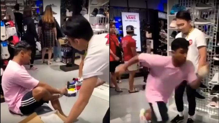 Deux jeunes hommes ont voulu faire une blague à un vendeur dans une boutique qui vendait des chaussures de sport des marques connues comme Nike, Adidas et Puma.