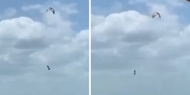 Cette personne essaie de faire du kitesurf. Malheureusement, un peu trop léger, le cerf-volant l’emmène très haut et l’empêche d’atterrir sur la surface de la mer.