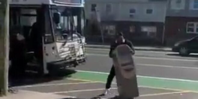 Cette vidéo montre un homme qui a volé un distributeur de billets automatique. Il traine l’objet et essaie de monter dans le bus avec l’objet