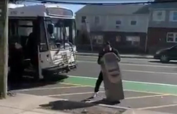 Non loin d’un arrêt de bus, une personne a filmé un homme qui trainait avec difficulté un distributeur de billets automatique. Visiblement, il vient de le voler quelque part et tente de ramener son “butin” chez lui en prenant un bus.