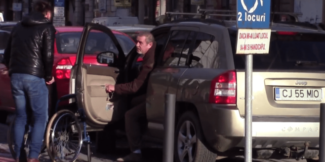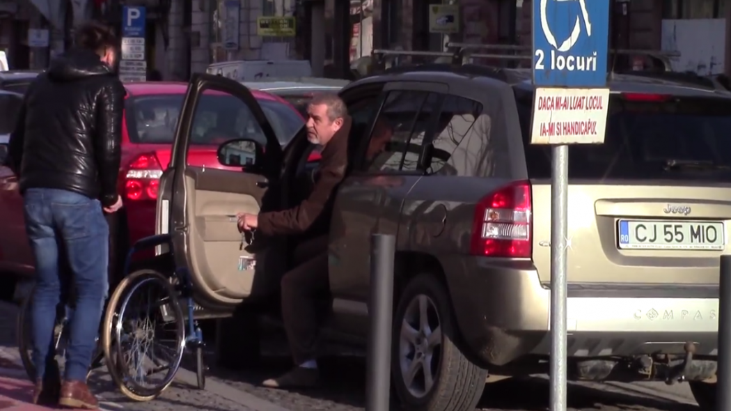 La vidéo montre un monsieur donnant une leçon aux personnes qui se garent sur un stationnement réservé aux personnes handicapées en Roumanie. Chaque fois qu’une voiture se gare, il les accueille avec une chaise roulante pour les aider.