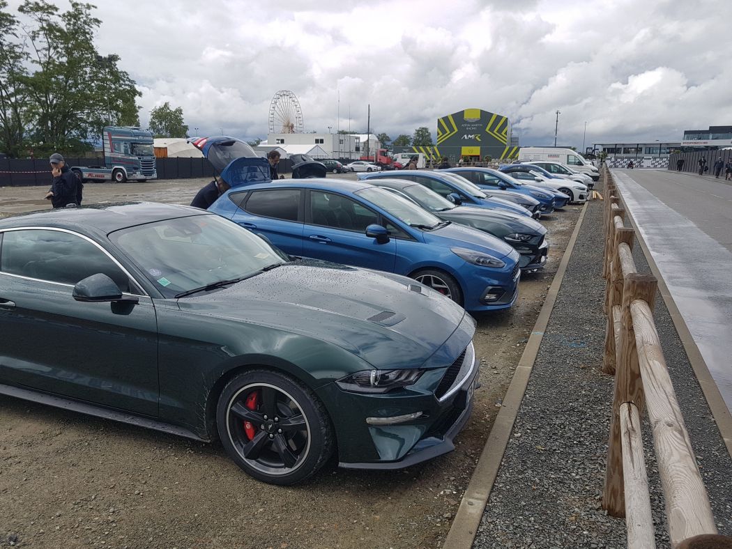 Après de franches accélérations et de bonnes pointes de vitesses, nous arrivons, Fiesta et Mustang Bullit sur le circuit Sarthois.