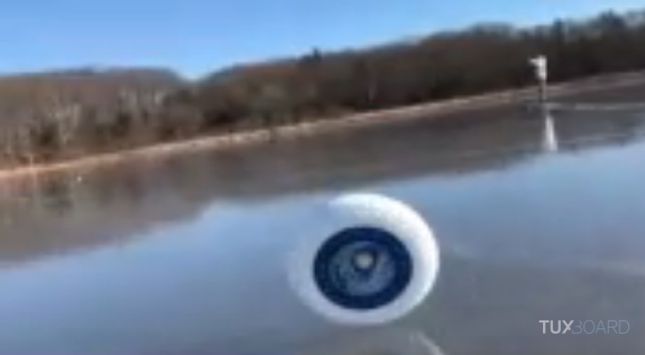 Une personne a publié la vidéo où on voit un frisbee roulé sur un lac gelé. Le disque en plastique est marqué par une inscription, il est suivi par une caméra avant de finir sa course dans les plantes aux abords du lac.