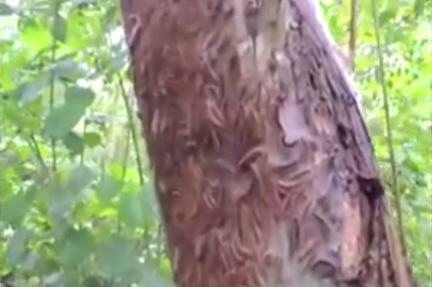 Cet arbre est infesté par des vers de tente qui tissent de la soie. Leur mouvement d’ensemble donne l’impression qu’un gros organisme ou animal se pose sur l’arbre.