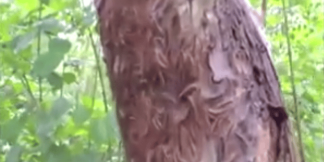 Cet arbre est infesté par des vers de tente qui tissent de la soie. Leur mouvement d’ensemble donne l’impression qu’un gros organisme ou animal se pose sur l’arbre.