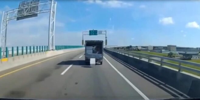 Sur une route, un pick-up transportant des mousses en plastique roule assez vite. Comme l’arrière n’est pas complètement couvert, l’une des mousses tombe deux fois en quelques instants sur la route.