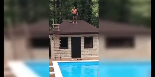 Ivre, il tente de sauter du toit de cette maison de jardin dans la piscine. Brutal faceplant !