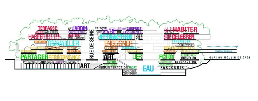 Jeuneville est un projet unique des bureaux de l’architecte Jean Nouvel. Il ne s’agit pas seulement de créer un nouveau quartier, mais l’architecte projette de réinventer le mode de vie et de travail au cœur de Paris. Il souhaite en outre allier plusieurs éléments comme la diversité des usages mixés à des espaces modulés avec une empreinte carbone réduit considérablement.