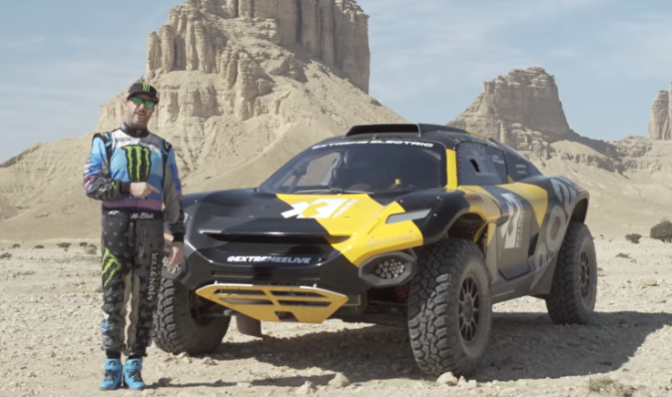 Durant la dernière étape du Rallye Dakar, le pilote Ken Block a effectué le test de la voiture de course électrique E Electronic Odyssey 21.