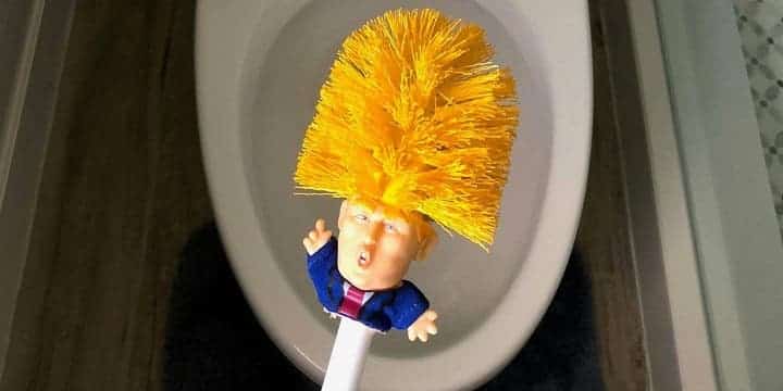 La brosse WC Donald Trump est maintenant disponible ! Cette reconstitution de Trump faite à la main, merveilleusement précises est : pratiques, donnant à la salle de bain une odeur et un bel aspect. Le 45ème président des États-Unis est placé au bout du manche, arborant un petit costume bleu, une cravate rouge avec une ressemblance inquiétante.