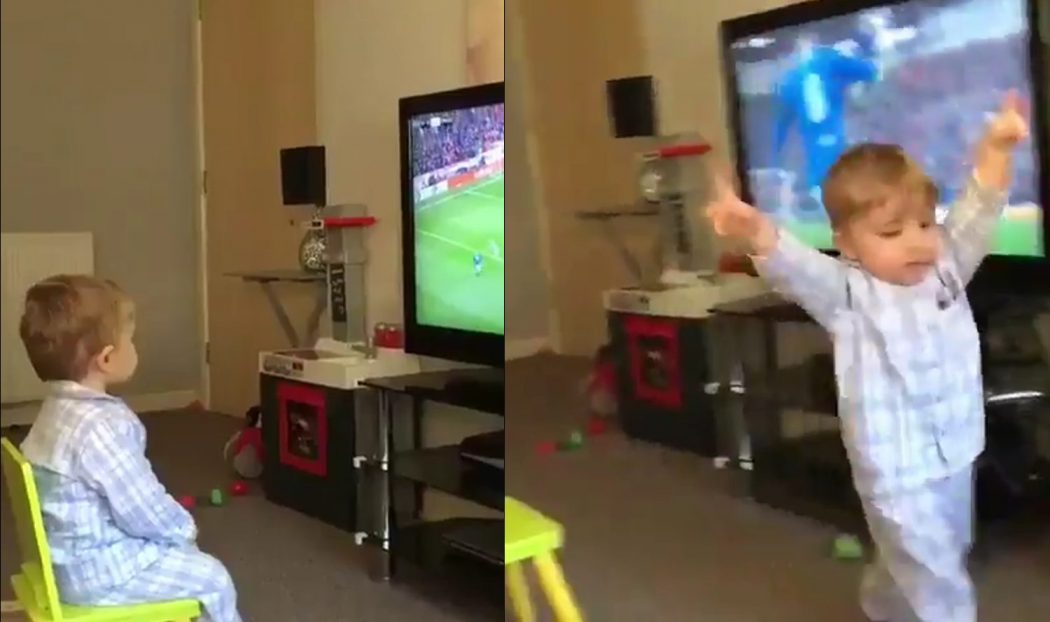 Un papa a filmé en vidéo son petit garçon qui ne dépasse pas les 3 ans d’âge, regardant un match. Quand son équipe préférée marque un but, il a commencé à courir partout dans la chambre exprimant sa joie.
