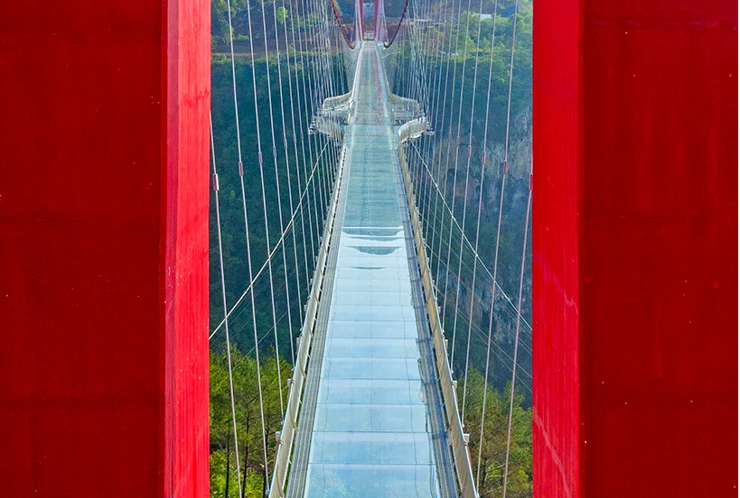 La Chine vient encore fois s’inscrire au Record Guinness. Après la plus haute balançoire au monde, c’est maintenant au tour du plus long pont en fond de verre que le pays accueille. Celui-ci mesure 526,14 m, et a été conçu par l’UAD. Il a été construit en dessus des trois gorges de Huangchuan à Lianzhou. Cette structure est constituée de 3 couches de verre de 4,5 cm d’épaisseur, très clair, pour laisser paraître la beauté de cette nature splendide.