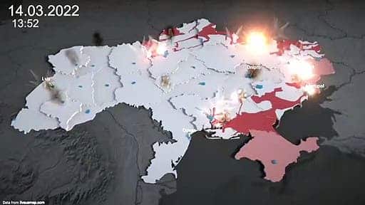 Une carte animée pour résumer la guerre entre la Russie et l’Ukraine. On peut voir l’envahissement de territoire ainsi que les frappes (qui sont les bombardements russes).