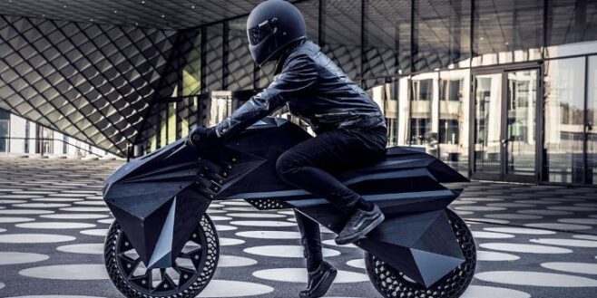 Cette moto étant équipée d’un moteur entièrement électrique, de pneus sans air, d’une direction sans fourche et de nombreux capteurs intégrés. Le design à facettes du bras d’innovation du fabricant d’imprimantes 3D est basé à Berlin. NOWLAB révèle à la fois les capacités et les limites de l’impression 3D de grande taille. Par ailleurs, les panneaux, les ailes et le carénage conçus par Marco Mattia Cristofori de NOWLAB avec Maximilian Sedlak confèrent à la moto électrique une attitude sombre d’un véhicule tiré directement d’un film à la barre de Christopher Nolan. Cependant, son profil géométrique est également assez simple qui reflète la force des imprimantes 3D additives. Cette technologie se penche toujours vers les angles plutôt que sur les courbes.