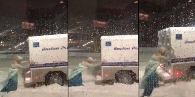 Il s’agit en fait de la vidéo d’un jeune homme déguisé en Elsa. Ce dernier aide une voiture de police lors d’une tempête de neige à Boston, aux États-Unis. En effet, coincée dans la neige, l’automobile n’arrivait plus à repartir.