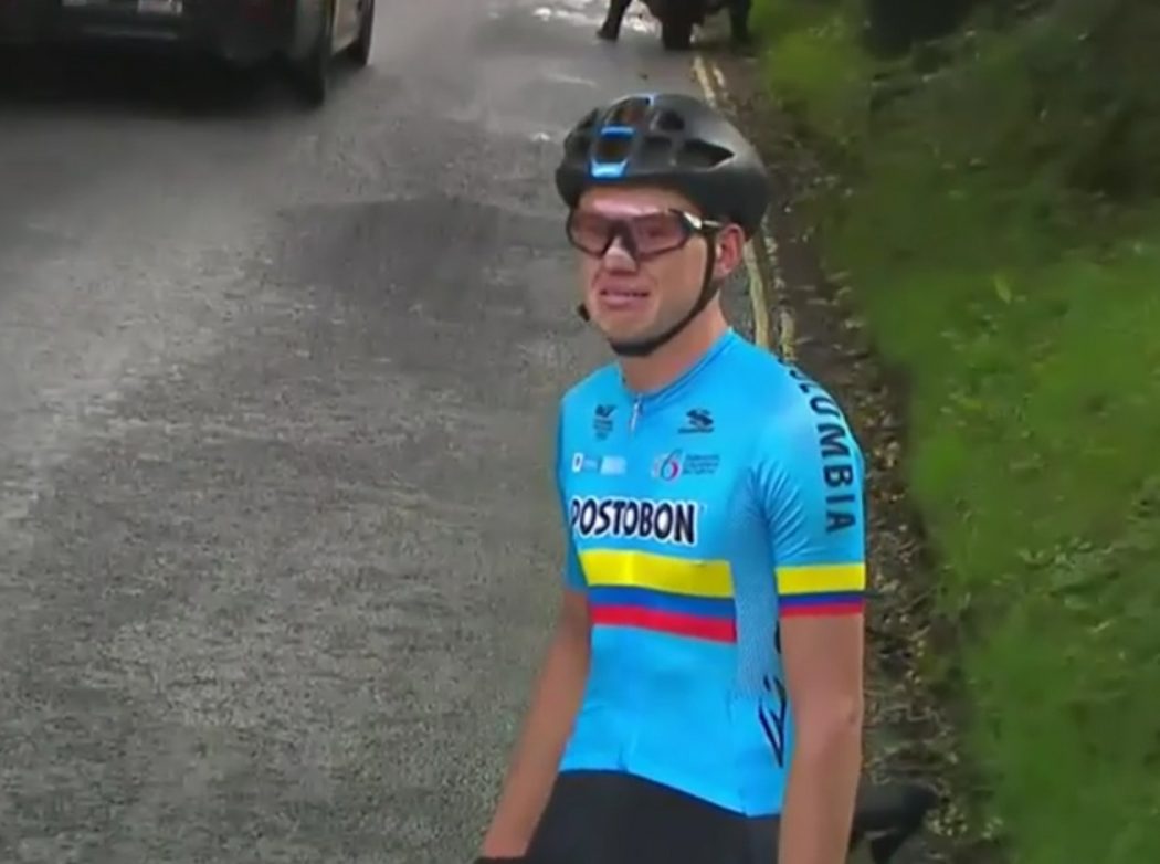 En pleurs, assis au bord de la route la roue entre les mains, sans personne pour l’aider, c’est la scène désolante montrée dans cette vidéo lors du mondial de cyclisme junior. Le coureur en question est German Dario Gomez Becerra, le jeune homme attend avec désespoir un dépannage.