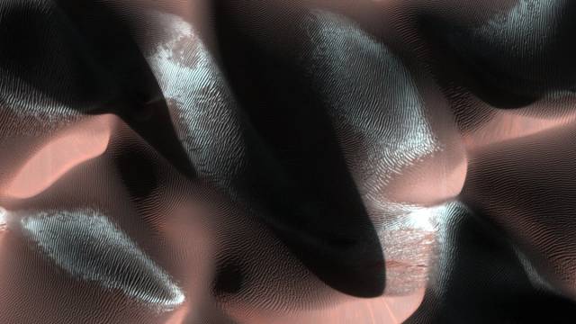 Cette photographie prise par un satellite de la planète Mars au petit matin est juste magnifique. On peut apercevoir de la neige sur les dunes.