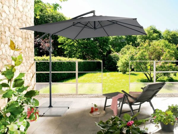 Lidl dispose aussi d’un parasol carré avec support latéral. Il se compose d’une structure en aluminium et en acier, d’une housse en polyester perméable avec un système de protection UPF 80.